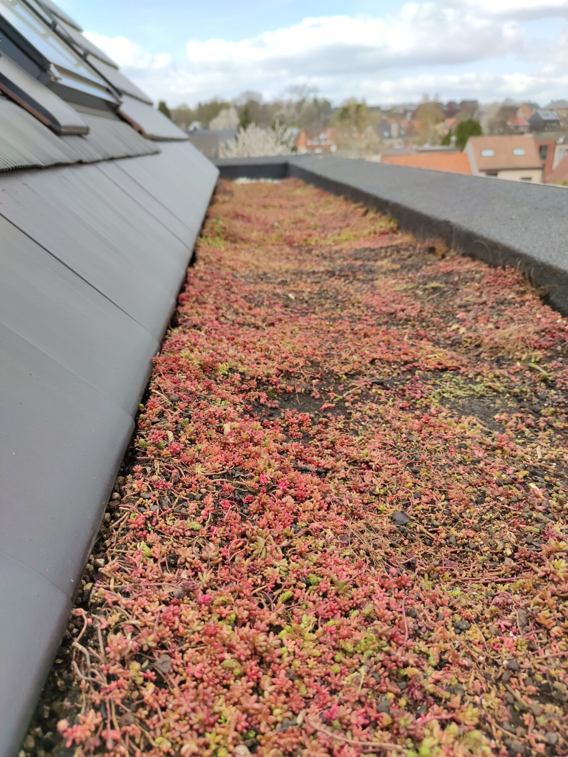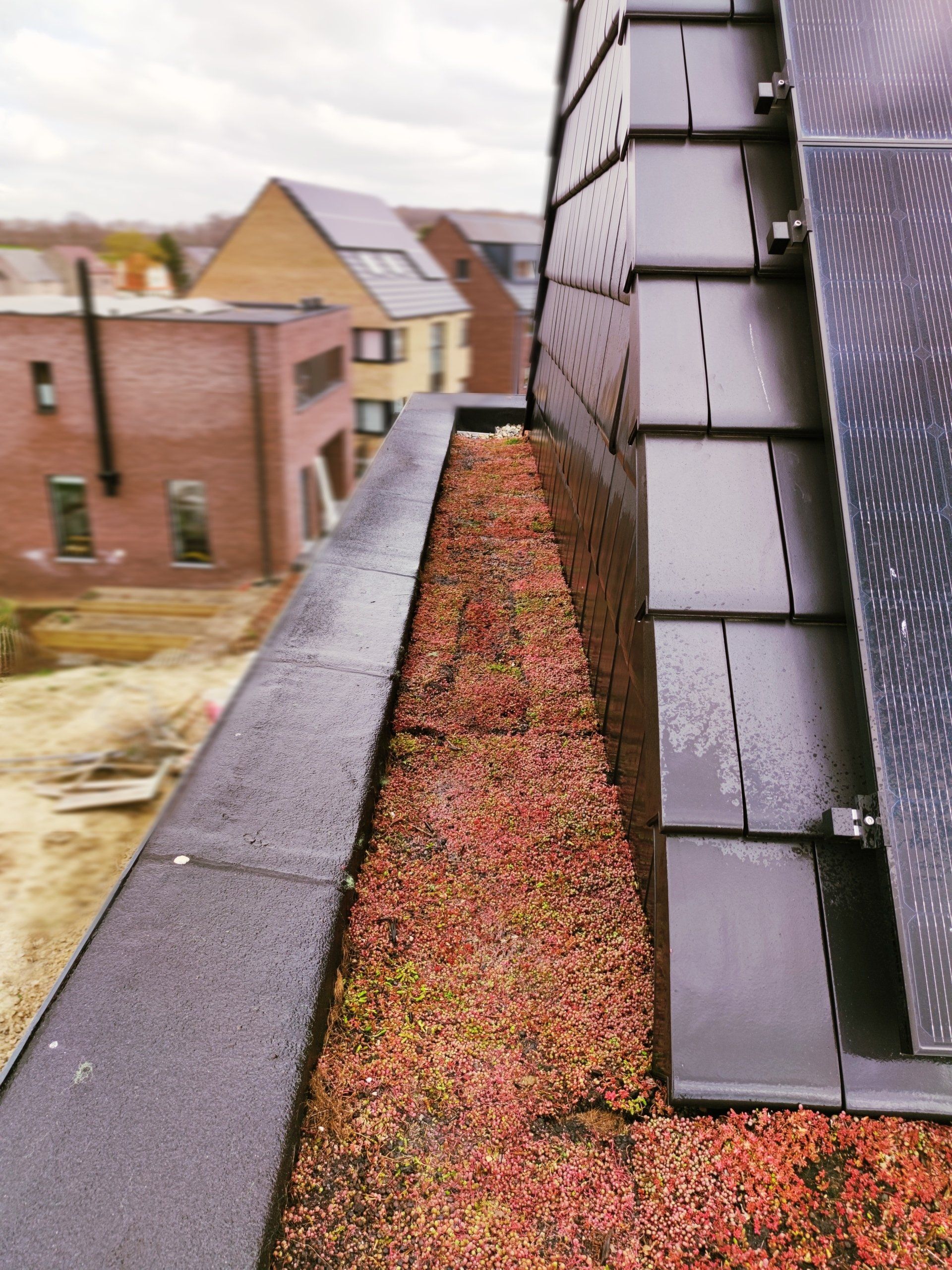 Bij de bouw van deze woning is er reeds wortelwerende roofing voorzien op het plat dak. Het groendak is hier geen vereiste van de gemeente uit, maar wens van de klant zelf. Afwisseling van zon en regen zijn ideaal voor de groei van sedumstekken in het beginstadium. Onze klant zal de groei op de voet kunnen volgen vanuit de slaapkamer. Veel plezier!