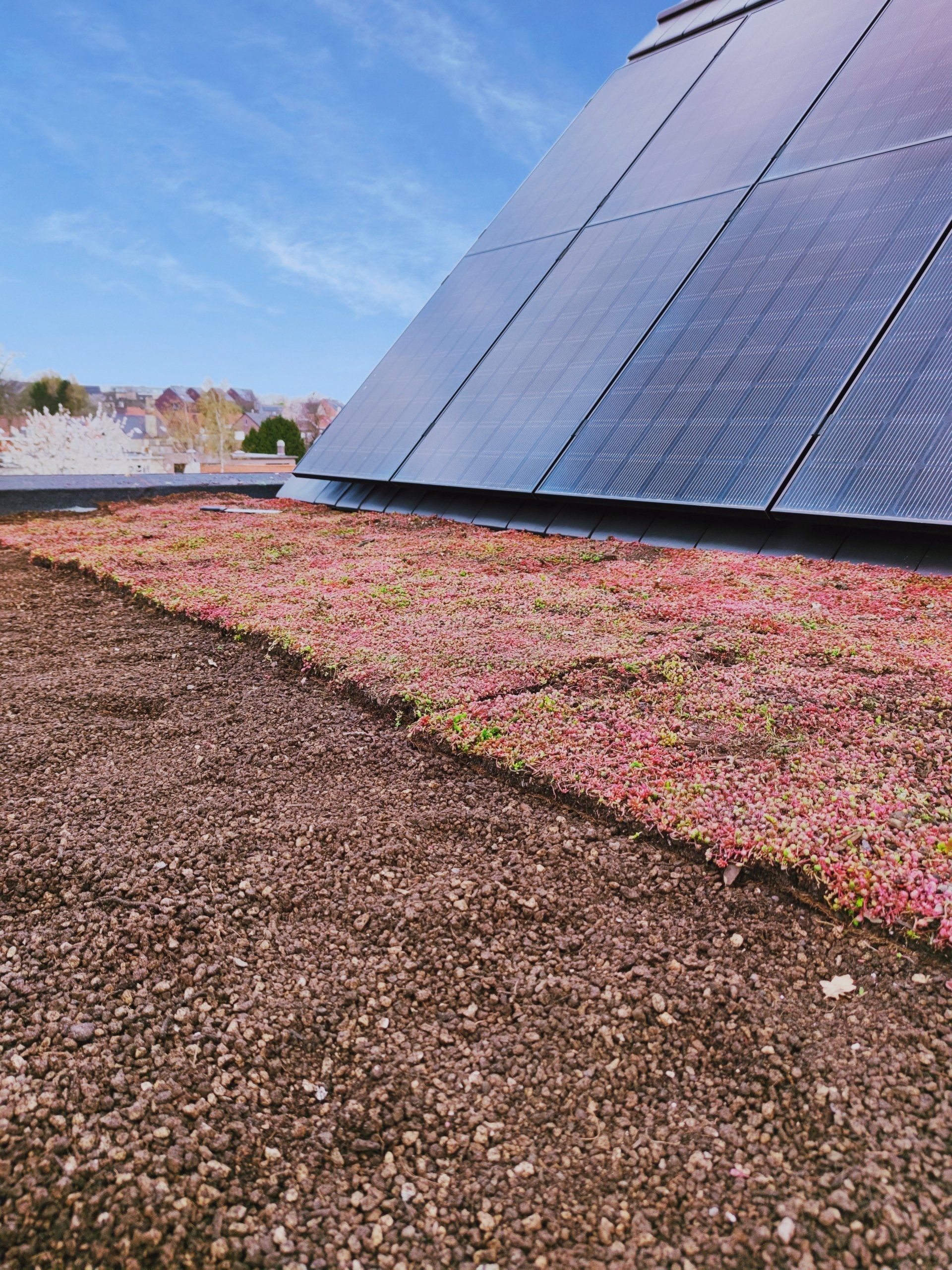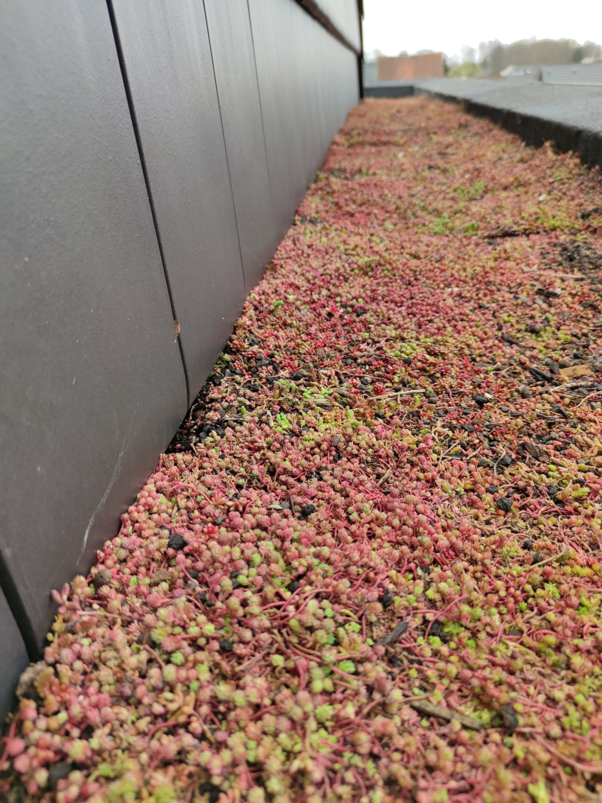 🌱 Deze vegetatiematten met jonge sedumplanten zijn net aangelegd, vandaar de 'rode' kleur. Binnen enkele weten zal dit mooi groen zien en voller in groei zijn.