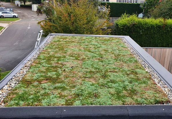 Net aangelegd groendak met sedummatten en stapstenen.
